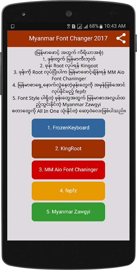 It saves your time with predefined shortcut phrases. It listens your typing actions and instantly provides you back your preferred phrases. The development team is always taking care of every user feedback and claim, to provide you a better experience of typing instant messages, also to go with flavors at your wish, both Zawgyi and Myanmar Unicode.
